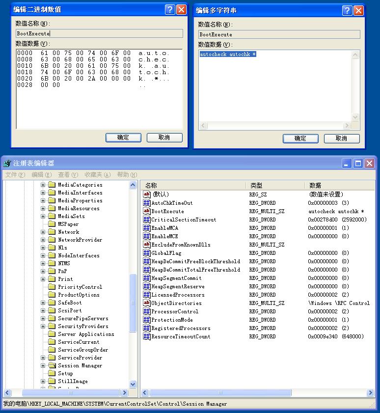 如果是windows xp的系统它自身就有这个功能的,如果你是windows xp系统?它没这功能了?请定位到注册表的这我的电脑\HKEY_LOCAL_MACHINE\SYSTEM\CurrentControlSet\Control\Session Manage个位置将右面键值名为BootExecute的值发上来看看是什么内容?有可能是它被修改了?