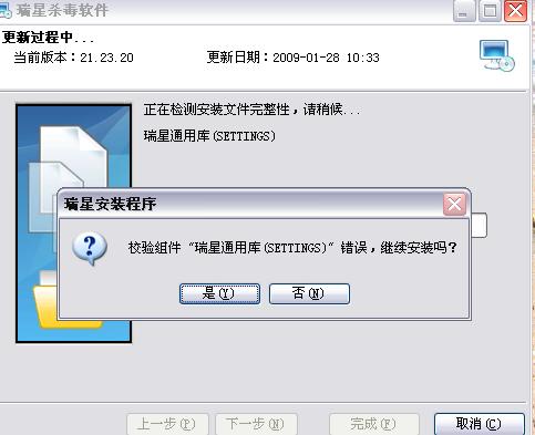 瑞星卡卡安全论坛个人产品讨论区瑞星杀毒软件瑞星杀毒软件2011 瑞星09版本升级问题:“检验组件“瑞星通用库(setings)”错误,继续安装吗? ”