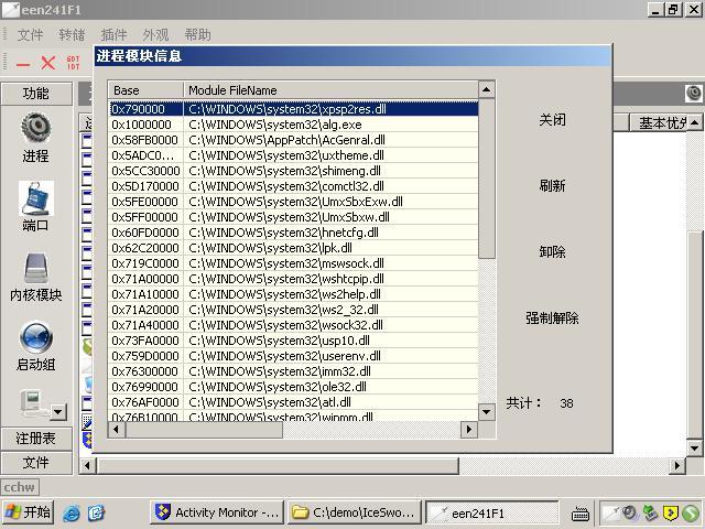 4, 找出病毒。还是选中刚才的进程,查看它的模块信息,如图4。先点下标题栏,排下序。然后和你朋友的比较下。一般都10个一组,看下对应的就好。这里是关键, 能找到不同的应该就是病毒了。