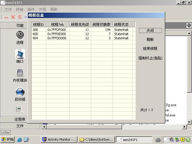 3,找出病毒的线程。在两台机子上都点进进程里面, 如图2。 然后选中前面的进程,查看它的线程信息,如图3。 并和你同学的比较。我估计这里应该能看出不同,顺便截个图,发上来看看吧。不过有没有都继续下一步吧。