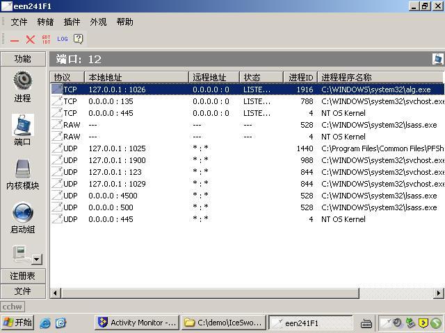 2,找出病毒的进程。 在你的机子的冰刃上点端口,如图1。看下可疑的网络地址,如果没有新的,就找前面两个地址对应的进程。 我估计找到的魔兽的进程。这一步之是要缩小范围,为下一步准备。