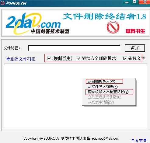 使用说明:删除时复制所有要删除文件的路径,在待删除文件列表里点击右键选择从剪贴板导入,导入后在要删除文件上点击右键,选择立刻重启删除,电脑会重启进入DOS界面进行删除操作。运行xdelbox前最好卸载所有可移动存储介质(包括U盘,MP3,手机存储卡等)。