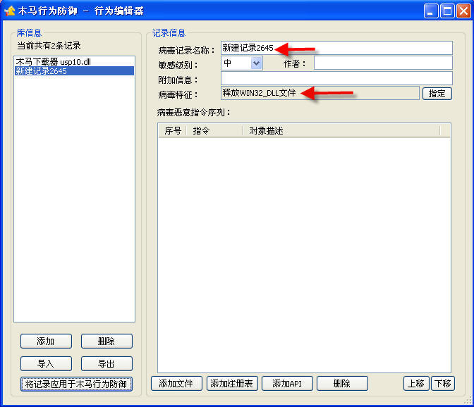 释放DLL就报警太粗了,很多程序后台升级都会报的。我有一个巧妙的办法,绝对不会有任何误报。这类木马群病毒不是在每个程序目录都创建USP10.DLL吗?就利用这点,不管它创建USP10还是其他什么DLL。你可以在非系统盘如D盘创建一个目录命名为ABC或者其他任意名字,在里面复制一个程序文件,任意程序如记事本。用木马行为编辑器,编辑规则,文件规则,任意操作,目录名字符串是D:\abc.主文件类型数值等于2就可以了。这个病毒会在所有的程序目录下创建DLL文件,就必然也会在D:\abc目录创建DLL文件,从而触发规则报警。而这个目录是你自编的,不会有任何程序在这个目录操作文件,所以不会有任何误报,但是却可以报木马群和蠕虫病毒。