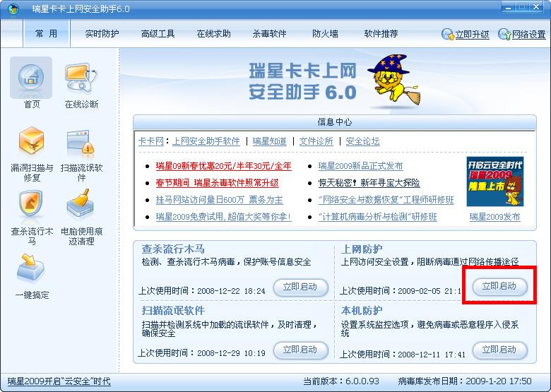 1、运行卡卡上网安全助手,点击“上网防护”栏下的“立即启动”: