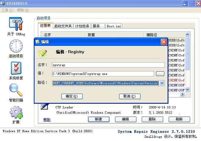 所以我们只需要用Sreng把C:\WINDOWS\system32\systray.exe添加到HKEY_CURRENT_USER\Software\Microsoft\Windows\CurrentVersion\Run启动项 如图3所示 重启后即可(当然也可以手动操作)