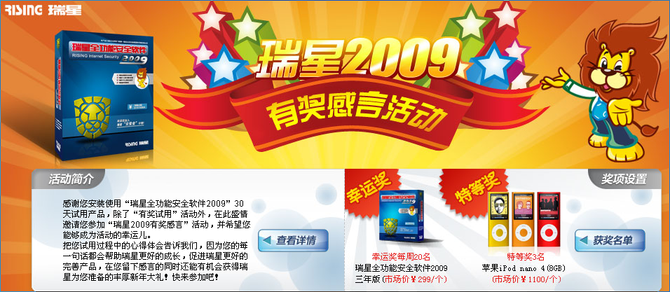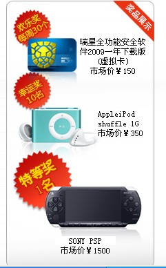 2、 “幸运奖”和“ 特等奖”获奖名单公布时间为:2009年2月26日,将会在瑞星官网上公示; 奖品在名单公布后尽快寄出(奖品以邮局普通邮寄发出)。