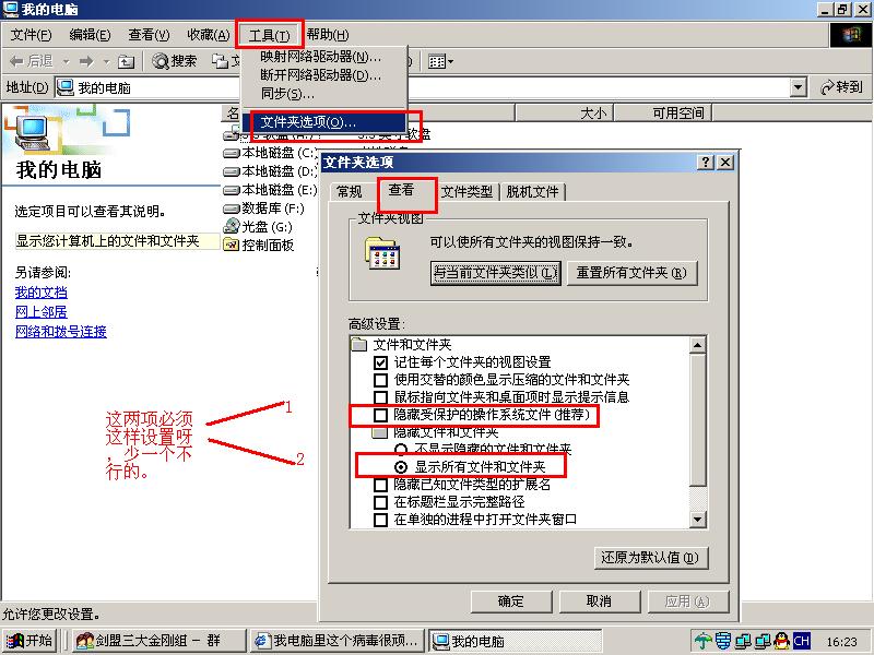 你在你的那“我的电脑”上面那菜单“工具”项内找“文件夹选项”设置你的系统显示隐藏文件、显示系统文件呀