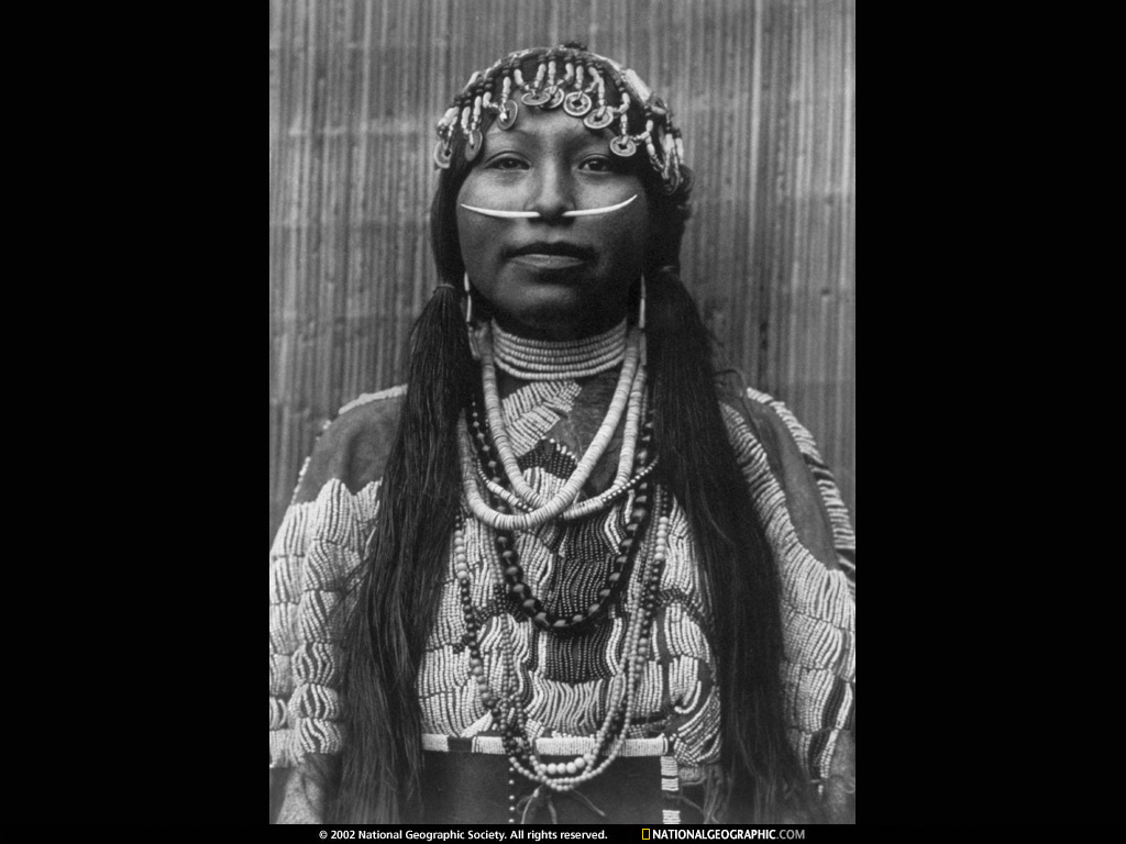 一位Wishham 印第安族妇女头戴着用买到的中国钱币串成的头饰,鼻子用贝壳装饰——这是财富和威望的象征。