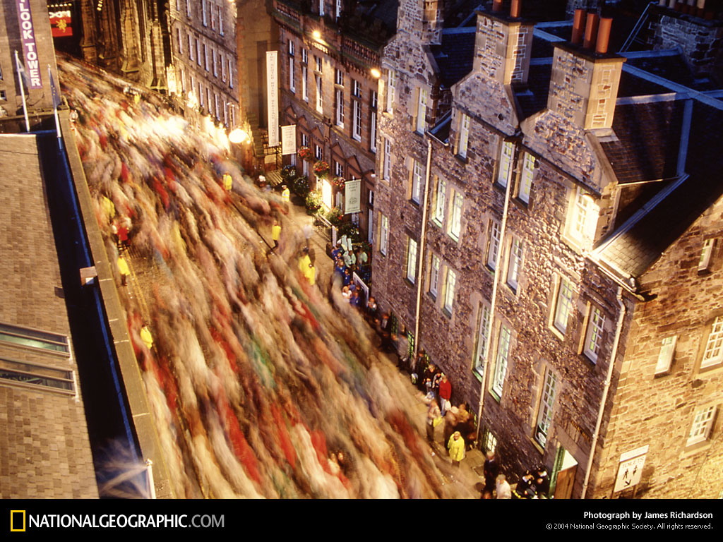 “‘在这张慢速拍摄的照片中,模糊的人流融入了爱丁堡的街景之中。’近来,这座拥有45万人口的城市,也是苏格兰的古都,在庆祝一些事情。仅仅15年以前,因为工业基础的崩溃,这个城市还萧条不堪。但是爱丁堡还是使自己摆脱出来重获新生。随着议会重组和高科技振兴之路的实行,爱丁堡认识到自己已经在新千年的世界众多城市之中占据一席之地,足以与世界上其他任何一个城市相竞争。”