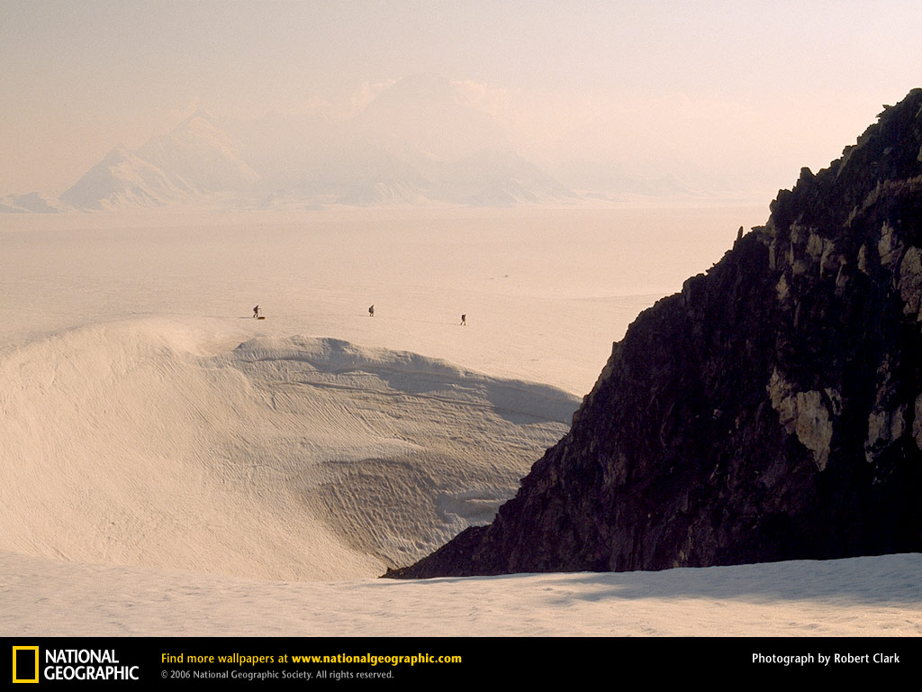 在加拿大育空地区的冰川和山脉交汇之处,一些山峰突出冰层,看起来就像冰封海洋中的岛屿。这些被叫做冰原岛峰的峭壁或许看上去很贫瘠,但生物学奖大卫·希克——远处右侧的滑雪者,已经发现他们全都是从脆弱的高山勿忘我到觅食的哺乳动物等数以百计的物种的避风港。
