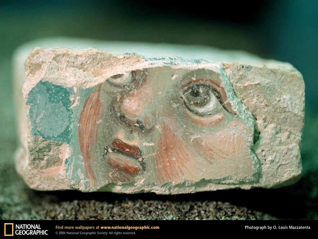 这个四英寸长(15里米长)的一块厚厚的亚西西圣弗朗西斯长方形教堂的壁画是1997年9月26日该地区大地震后找回的最大的碎块之一。自然灾害、现代危险源及衰败威胁着意大利的遗产,市民和科学家们奋力保护着这些遗产。