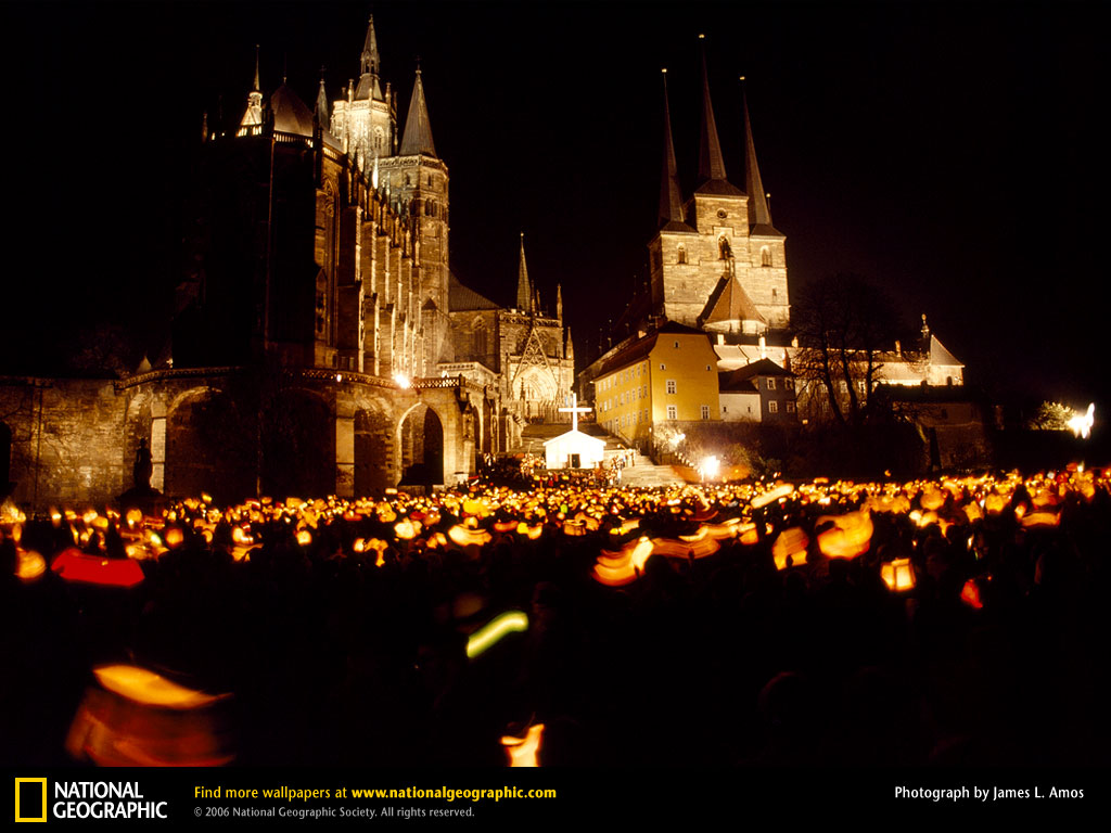 在东德埃尔福特,两种对立的信仰再次融合于孩子们手中散发出的光芒之中。马丁路德曾经在这里学习并在左侧的教堂被任命为牧师。每年的10月10日,马丁路德生日这天,新教徒和天主教徒汇聚于此以纪念他和天主教的圣马丁。他们的名字通常在10月11日斋日这天被赐予新生婴儿。