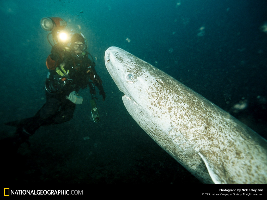 “它在我身边上浮并且旋转,知道几乎身体竖直...我看到它张开嘴,想起来没有格陵兰鲨攻击人的记录,闪光灯的干扰最终让它游走了。