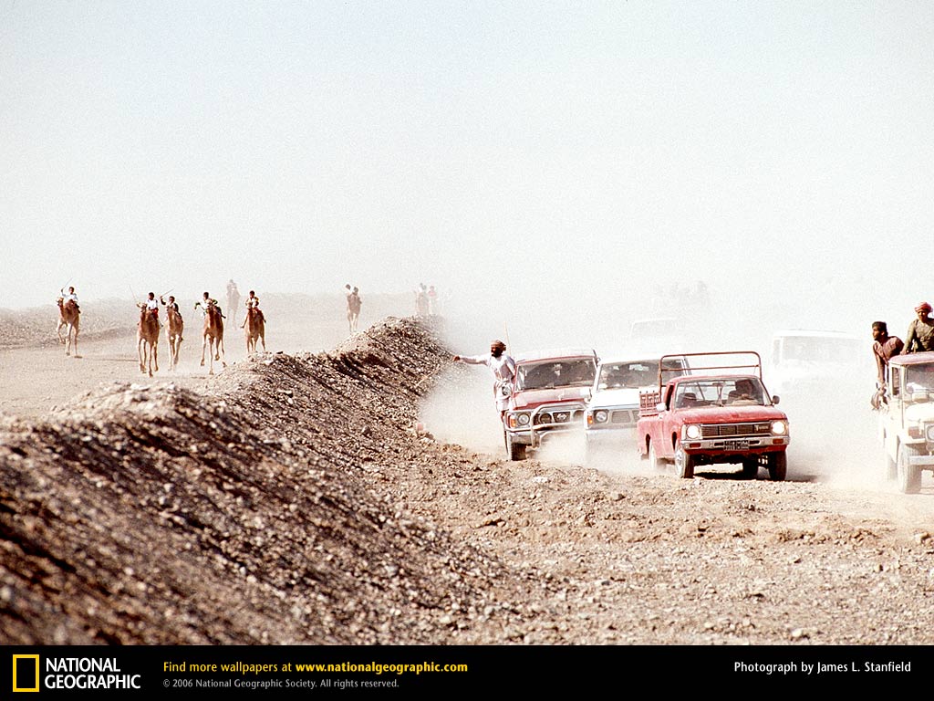八岁大的骑师们骑着骆驼雷鸣般的跨越护堤跑马场,冲向终点。阿曼人搭着便车跟在旁边观看。虽然在穆斯林国家,赌博是被禁止的,但是给予比赛冠军的奖品其价值可能高达50000里亚尔,或130000美元。