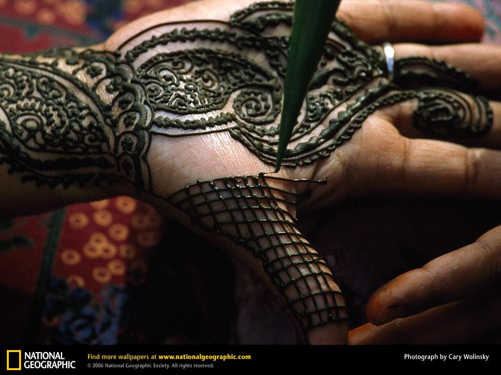这名妇女正在她用来举行仪式的手上装饰一种带网格的指甲花,而这只手先前已经绘制了有涡纹图案的蕾丝。指甲花来源于一种名为Lawsonia inermis的灌木的叶子。把这种灌木的叶子晒干,磨成粉,然后混上水,最后抹在皮肤上,过几天甚至几周后,等颜色从皮肤上消退后就制成指甲花。