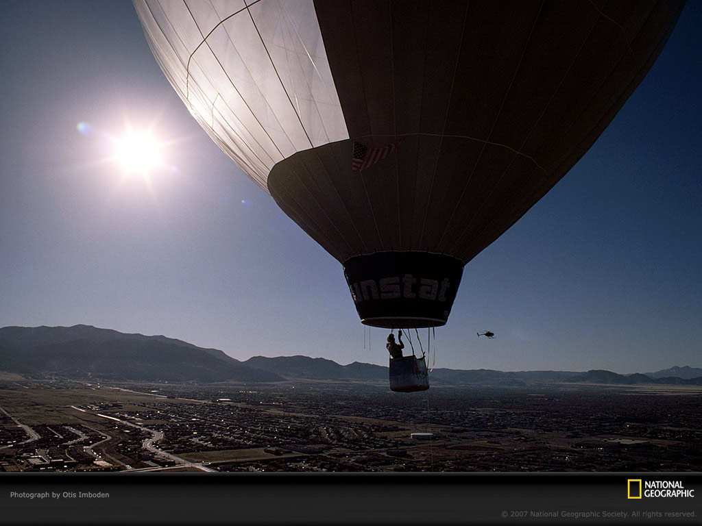 发明家及热气球驾驶者弗雷德里克·埃索驾驶着他的发明–首架可操纵太阳能热气球在美国新墨西哥州的阿尔伯克基上空飘过。气球透明的球布(左侧)将阳光投射到对面的不透明的吸热球布上,可以加热气球内的空气,使其悬在高处。经过了四个多小时及12,500英尺(3,800米)的飞行后,埃索的首航大获成功。
