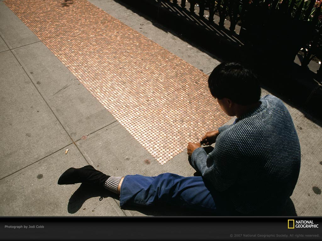 一位街头艺术家正在往百老汇大街的人行道上铺着一分硬币,这恰如其分的诠释了某位天才经纪人对这条大街的评价“只受一物驱使:钱”。长达17英里(26公里)的百老汇大街最初是条印第安小路,其从曼哈顿岛的一端直至布朗克斯区,横穿了数条纽约的著名大街。
