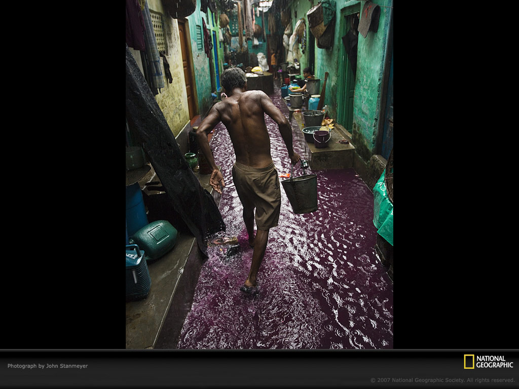 在加尔各答的一条胡同里,一名男子正在因染布而变成紫色的水中行走。这种死水会孳生大量的疟蚊。虽然在半个世纪前,在北方的温带地区通过喷洒DDT和排干沼泽的办法已经消灭了疟疾,但其在亚洲潮湿的热带地区却仍根深蒂固。季风降雨以及排水不畅,使得这种疾病仍在印度的许多城市中肆虐。