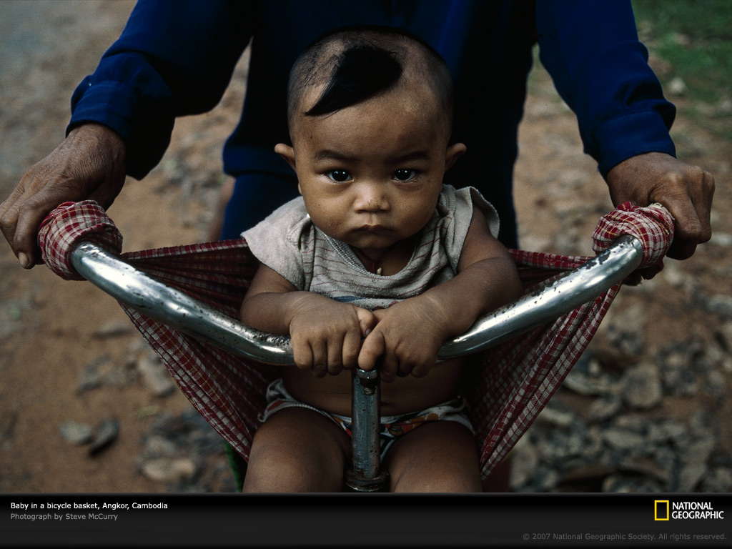 在柬埔寨的吴哥,一名坐在简易车筐里的孩子正注视着镜头。在某些佛教文化中,儿童剃光头非常普遍,常常只留下前额的一小撮。