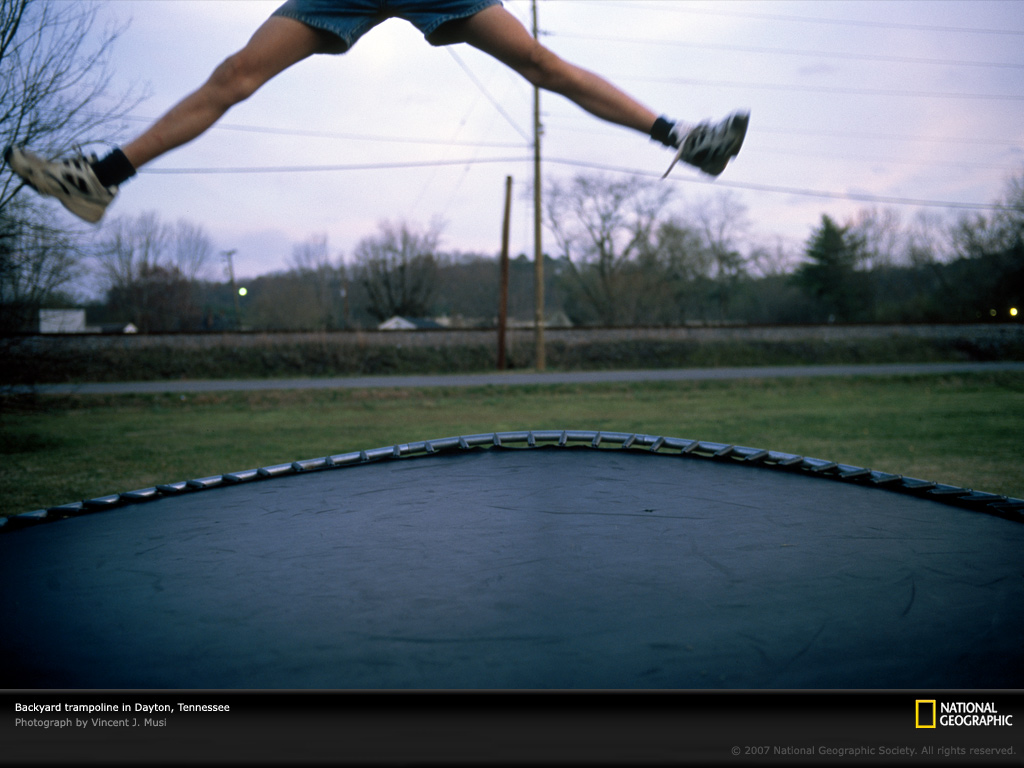 在田纳西州代顿市的一家后院,一个在蹦床上跳跃的人跳出了画面。代顿如今是座有着大约6,500人口的安静社区,这座圣经地带上的小镇是著名的1925年斯科普斯“猴子”审判发生之处,当时代顿教师约翰·斯科普斯因在公共学校讲授进化论而被裁定违反了田纳西州的法律。