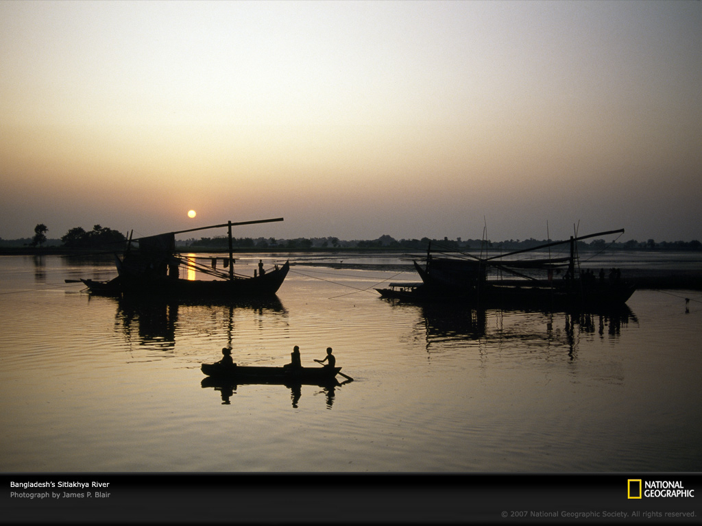 在洪水泛滥的西拉克亚河上,一叶扁舟从渔船旁划过。孟加拉国毗邻印度东部,是典型的穆斯林国度,它饱受洪水蹂躏。南部的孟加拉湾,遍境汹涌澎湃的江河,肆掠季风台风使得孟加拉国每年三分之一的国土都洪水泛滥。