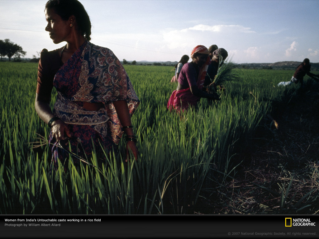 一群低等种姓的印度妇女在一块广茂的田野里种植水稻。低等种姓的社会身份通过血缘继承,这些处在社会最底层的“贱民”在全印度约有1.6亿,约占印度总人口的15%。根据印度种姓制度,他们被认为是肮脏的,只能从事最累最脏的工作。