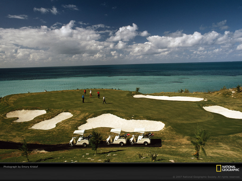 三杆洞的第8洞就在海边,这无论对前来消遣的爱好者还是职业好手都是极富挑战的。在绿茵远处,近岸浅滩和深水区的海水泾渭分明。百慕大处于珊瑚岛世界分布最北端,是海底16000英尺(4877米)山脉露出海面的部分,不少地方并不比海平面高多少,绝大部分领土海拔低于260英尺(80米)。