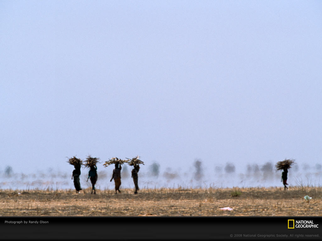 苏丹沙漠中,妇女们头顶着捆好的柴薪。非洲乡村文化中,妇女们通常负责寻找木柴的工作。在苏丹恶劣的干燥沙漠里,作物难以生长,她们每天要花数小时拾取煮饭的柴火。