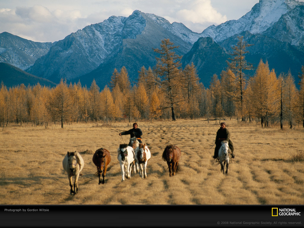 两个蒙古牧马人正驱赶着他们的马匹,他们背后的山峦高达3000米,这些牧马人在越冬之后,从山的那一边将牧群重新带回达哈德山谷。蒙古牧民们世代都是这样带队翻越山峦过冬。不过蒙古政府计划让牧民们过上的城市生活,因此这种每年两次的艰苦跋可能很快就再也看不到了。