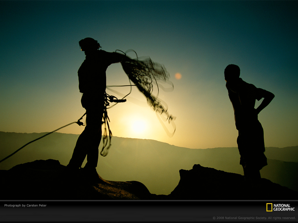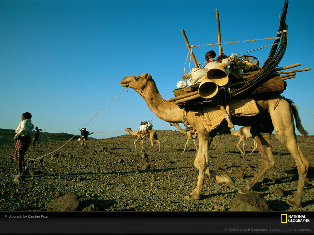 埃塞俄比亚丹纳基尔沙漠里两名登山者准备沿着山体向下到达厄特尔火山。这个活火山活跃了将近一个世纪,火山口中间则是一潭熔浆。