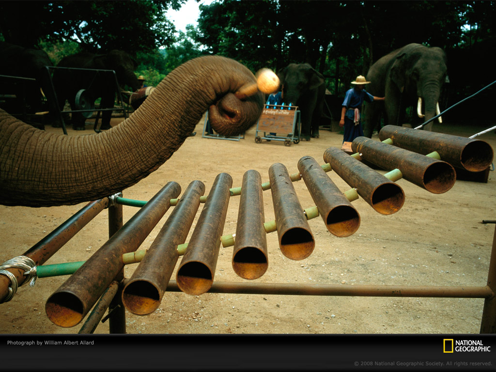 泰国喃邦的大象保护中心内,大象正在发挥乐器弹奏方面的创造才能,这些超大号的乐器也包括这个专门订做的木琴。训象的人训练大象移动前腿来弹琴,但是这类没有什么音乐细胞的动物却喜欢自由选择旋律和节奏。