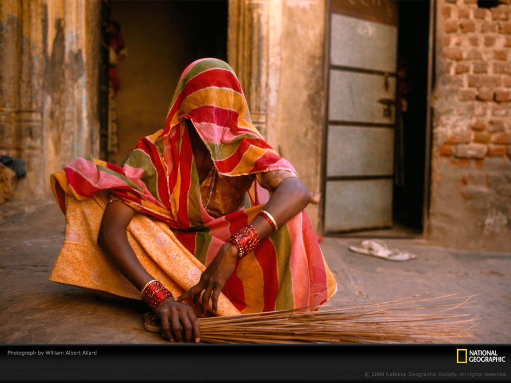 由于要拍摄照片,一个戴着面纱的印度妇女停下了打扫屋外卫生的活儿。 现在,虽然印度宪法禁止种族歧视并特别取消了这种“不能触摸”的体制,但是印度教的等级制度和社会形态还是让这种体制保存了下来。