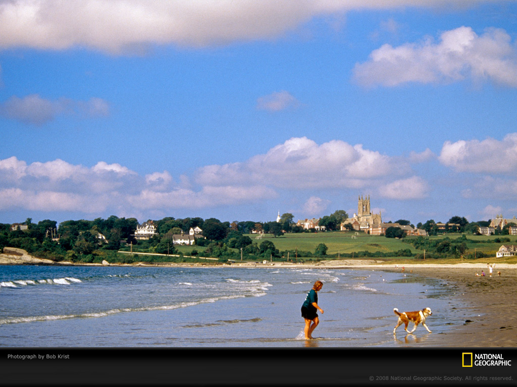 一个女人和她的狗在海水退潮的罗德岛新港沙滩上散步。这个只有27000居民的小城市每年却吸引着20万游客前来沙滩休闲度假,了解度假小镇的古今历史,观赏许多新港有名的海滨公寓。