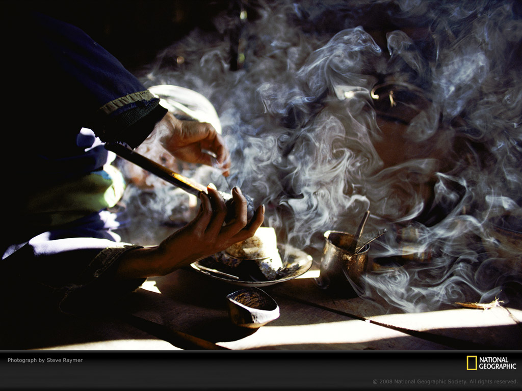 春节时,阳光照进一名妇女的矮小屋子里,此时她正在吸食鸦片,屋中飘起蓝色的烟雾。她的家位于泰国的蒙河镇。泰国曾经是重要的鸦片和海洛因的产地,但是当地政府在20世纪80年代开始根除这些,经过努力,显著地削减了罂粟种植量。