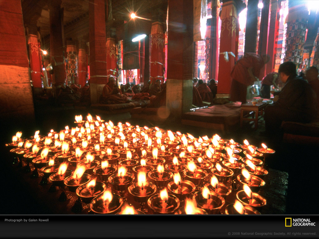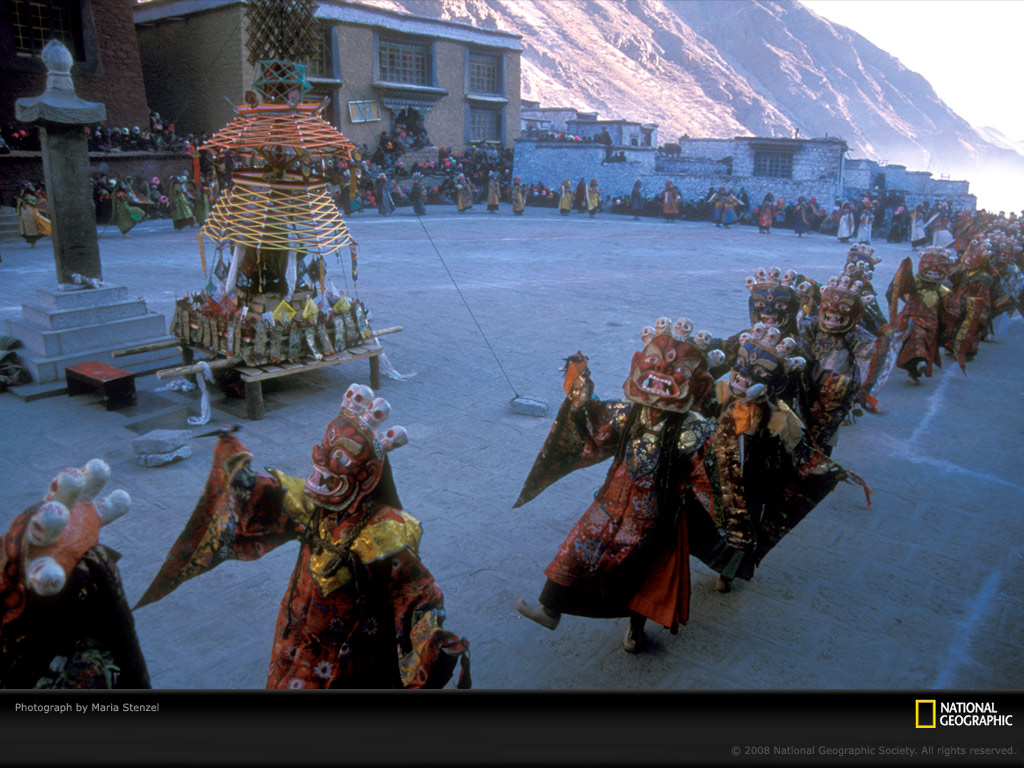 藏族人对在藏历新年期间宜做和禁忌做的事情很清楚并严格遵守规矩。藏历新年的庆祝仪式荡气回肠直至来年。图中来自拉萨周边的噶玛巴本寺楚布寺的佛教徒僧侣正跳着膜拜达摩的舞蹈来驱除邪气。