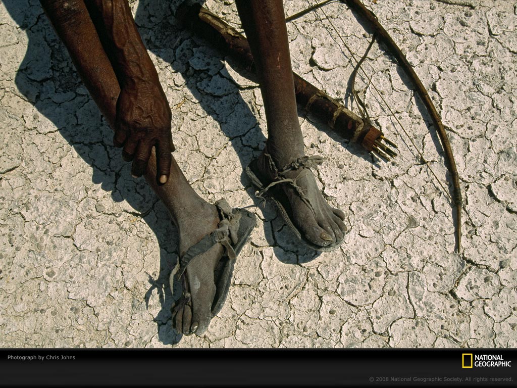 猎人正在休息。与其他早期社会相比,他们拥有一项重要的优势: 它们拥有可在没有地表水的条件下生存的本领。它们知道在哪可以找到多汁的瓜和块茎。同时在雨季它们将承满了水的鸵鸟蛋埋起来,然后到了旱季再将它们取出来。这些不可思议的知识可以让这些人可以在其他人无法生存的地方生存下来。