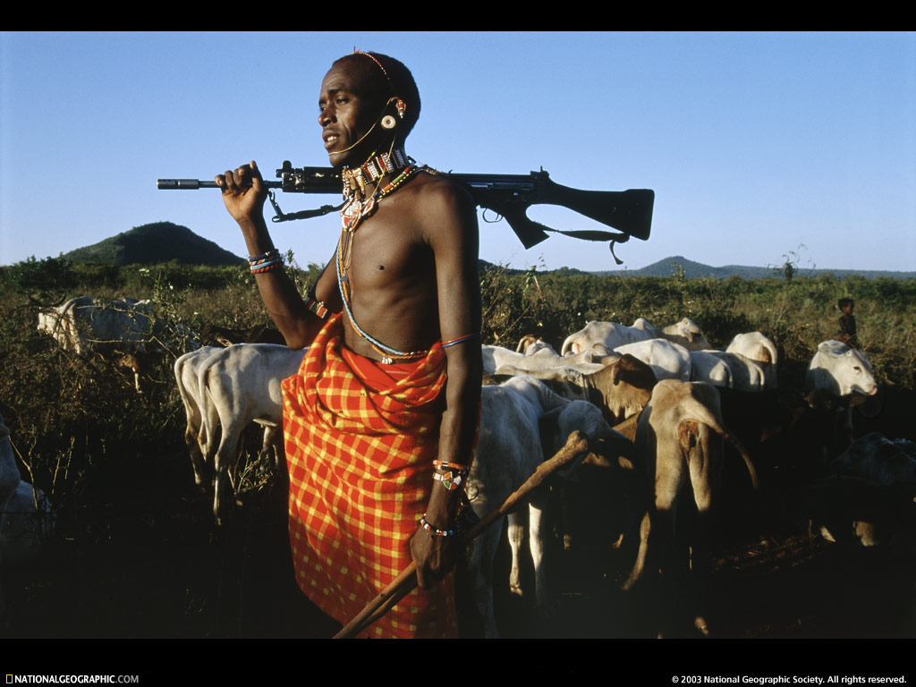 “为了匹敌武装畜牧抢夺者的火力,一位阿里尔部落勇士扛着由政府提供的步枪,‘没有枪我们不堪一击’约瑟夫·莱库顿,一位受美式教育的阿里尔部落族人说到。在玛萨比特山脉,依赖于牛奶和牛血养育的10000阿里尔部落族人大部分仍保持着游牧生活,不愿迫于政府压力而定居。”