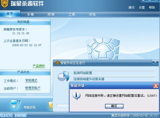 晕死了!我的瑞星防火墙和杀毒软件只升级到3月5日,就不能升级了?