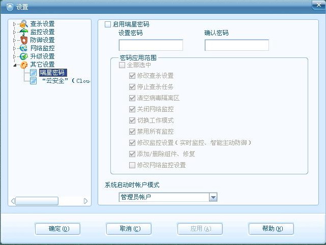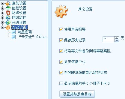 点“其它设置”,不要点“瑞星密码”或“云安全”,点开就看到了,在最后一个。