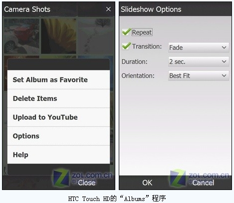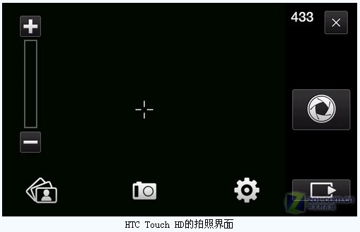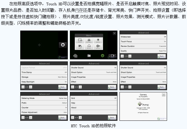 和Touch Diamond、Touch Pro相同,Touch HD的机身还是没有启动拍照的快捷键。该机的拍照功能只能通过TouchFLO 3D中的“图像和视频”或程序列表中的“相机”启动,而拍照时只能使用屏幕上的虚拟快门键进行。Touch HD采用了HTC拍照软件6.6(Build 32687版),加入了类似于索尼爱立信X1的触摸对焦,使HD可以根据用户预先触碰的区域作为焦点进行对焦。HD的摄像头支持拍照、摄像、全景照片、联系人照片、彩信视频和相框拍摄,可以调节亮度、白平衡和设置自拍定时器,照片和视频都能存储在机身内置存储空间以及microSD存储卡上。