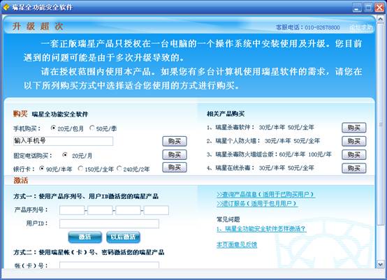 (瑞星单机版产品授权在一台计算机的一个操作系统中安装使用)如果超出授权,那么会出现升级超次的情况。如果确实需要多台计算机使用瑞星软件,可以根据实际需要去购买瑞星企业版软件或购买多套单机版软件。