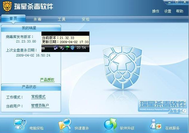 不好意思,才用瑞星,怎么瑞星病毒库的版本是21.23.33.00