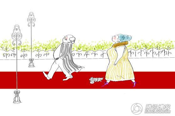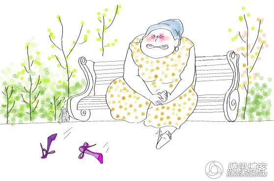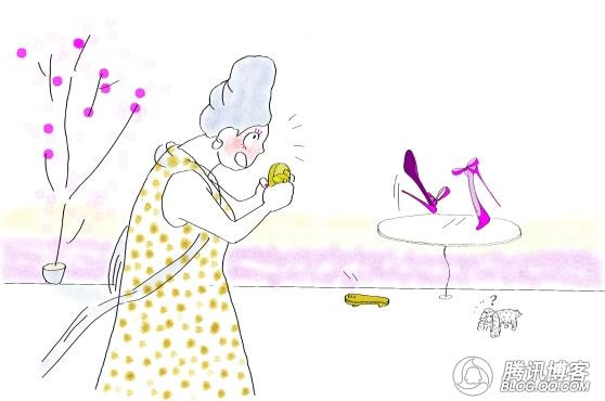 贵妇人回头选择了高跟鞋,高跟鞋得意洋洋,对平底鞋轻蔑的微笑。