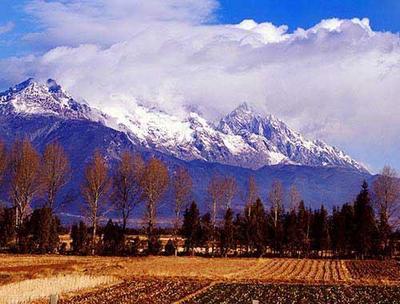 玉龙雪山——位于丽江的西北部,距离县城约15公里。在丽江古城中可以看到玉龙雪山的主峰--海拔5596米的扇子陡,如果想要看清玉龙十三峰,需要乘车到鸣音览雪亭。雪山上植物资源非常丰富,有植物王国之称。种类繁多的植物,按不同的气候带生长在山体的不同高度上,成为滇西北横断山脉植物区的缩影。玉龙雪山主峰还是一座处女峰,尚未被人类征服。山上经常云遮雾罩,只有太阳很好的时候,才能一睹真容。