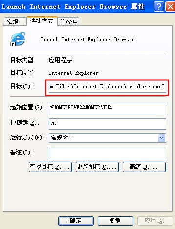 “目标”右侧的字符串应该是:"C:\Program Files\Internet Explorer\IEXPLORE.EXE"。