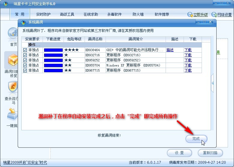 7、漏洞补丁在程序自动安装完成之后,点击“完成”即完成所有操作