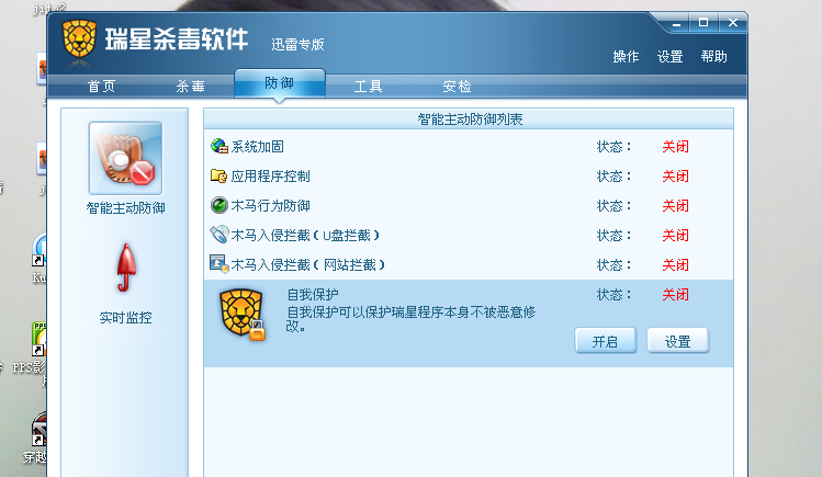 2、你的瑞星防御设置各个项目都处于关闭状态,可能原因有三: