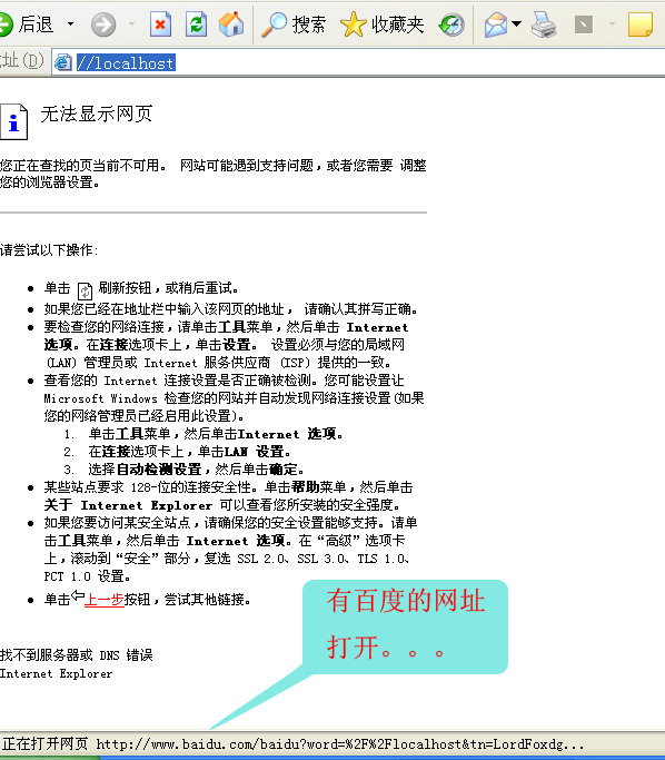 我现在用//localhost访问apache+php+mysql时就击活了百度的网址,//localhost不能运行,防碍了我制作PHP程序,请各位帮忙,这是什么坏东东?见图。