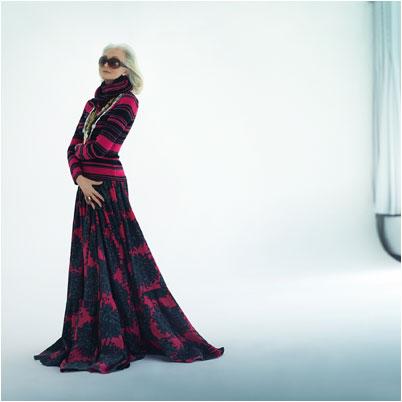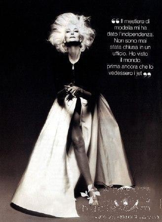 卡门那标志性的银发在时尚人士心目中具有一种“凌厉的优雅”,很难说《穿Prada的女魔头》中女主编的形象创意没受到一丁点儿的影响;她一米八的身高和修长的双腿可以胜任任何高级时装或成衣;她那威慑的蓝眼珠和棱角分明的面部轮廓可以为摄影师创造出一切想要的效果。