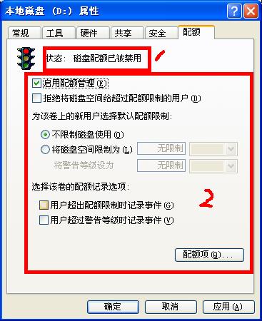 我按你说的查看了一下,很奇怪,我的C盘配额是符合的你说的,但是奇怪的是D,E,F,盘的属性打开根本没有配额这个选项卡,这是咋回事?、不是硬盘出问题了吧?